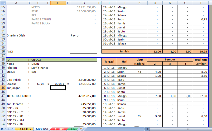 Seperti yang saya debutkan diatas bahwa penggunaan Page Break ini sangat cocok untuk pengolahan data yang bersifat sama setiap halaman misalnya slip gaji atau data lembur seperti gambar diatas.