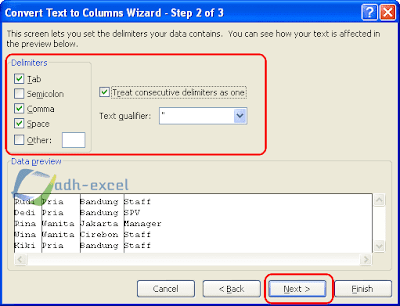 Pilihan yang pertama pada menu Text to Columns adalah Delimited, dengan pilihan ini kita akan membatasi teks menjadi sebuah cell dengan pembatas yang telah kita sebutkan diatas.