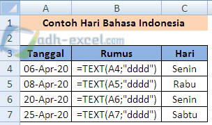 Dengan rumus tersebut diatas maka hari akan otomatis muncul dalam bahasa Indonesia sesuai dengan tanggalnya.