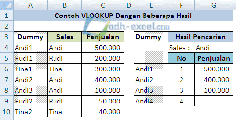 Dari contoh gambar diatas kita akan menampilkan hasil pencarian untuk nama sales Andi dan semua penjualan atas nama sales tersebut muncul didalam kolom G.