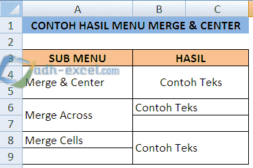 Dalam contoh gambar diatas terlihat perbedaan hasil dari masing - masing sub menu yang ada pada Merge & Center tersebut.