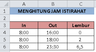Pada contoh yang kedua tersebut jam istirahat hanya dihitung 1 jam saja yaitu jam 12:00 sampai dengan jam 13:00.